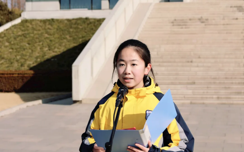 在校园周恩来铜像广场前,初三年级学生代表面向周恩来总理铜像肃立、三鞠躬。徐若晴、沈思涵等四位同学诵读《追思伟人风范,传承恩来精神》,朗朗之声回荡校园。在领誓人王郢琪带领下,全体同学庄严宣誓。赵树青校长嘱托淮外学子内化“恩来精神”。大课间期间,初一至初三年级全体学生于操场参与“周恩来故事微宣讲”,在生动讲述中接受精神洗礼。